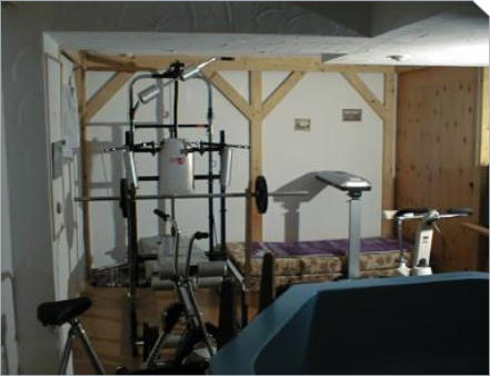 Fitnessraum, Sauna, Gartenpergola, Grill.